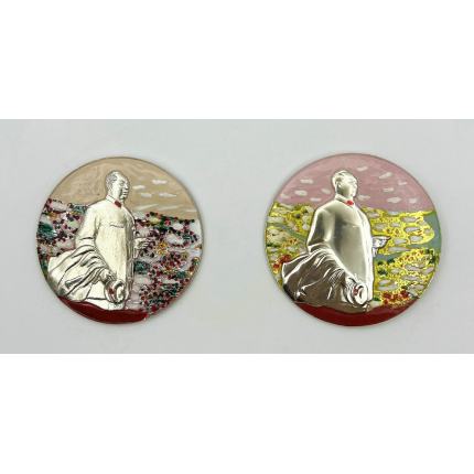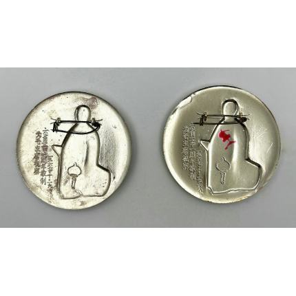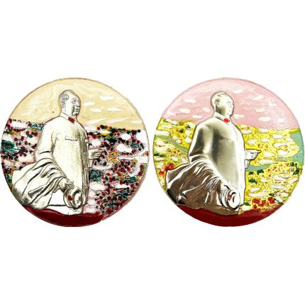 拍品详情:本品为一对1968年10月制作的伟人视察六省一市一周年纪念章,双章正反面完整保存,为特殊油彩工艺徽章的典型代表。 正面设计: 圆形章体采用独特油彩多层绘制工艺,色彩绚丽饱满,背景融合天空、白云、花海、绿野等元素,色彩过渡自然,堪称“油彩章”中的精品,体现了当年制作者手工绘制的精湛技艺。 背面铭文: 两章均竖刻清晰铭文:“为伟人视察六省一市周年敬制”及起止时间“一九六七年·十·一九六八年·十”,明确纪念1967年伟人视察华北、华东六省一市事件一周年。右章背面另见当年红色印记(可能为发放或使用标记),更添历史痕迹。 此对章不仅为历史事件的实物见证,更以稀有的油彩工艺、双姿态人物设计及完整铭文,成为像章收藏中兼具史料价值与艺术美感的珍品。